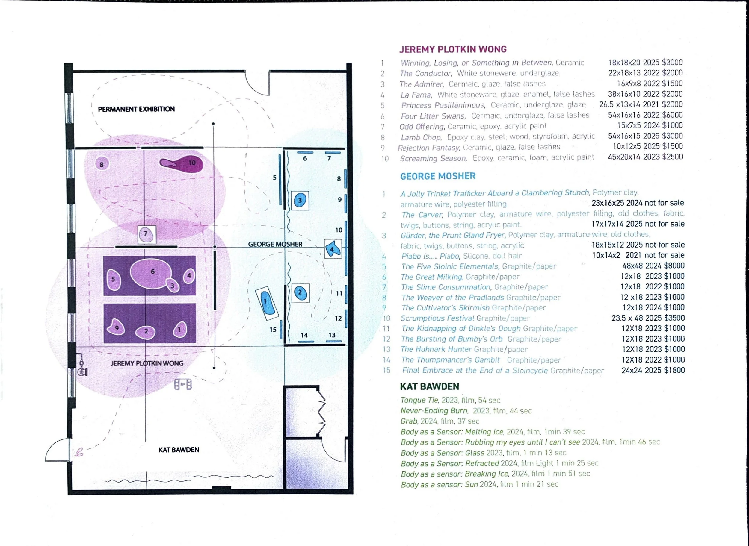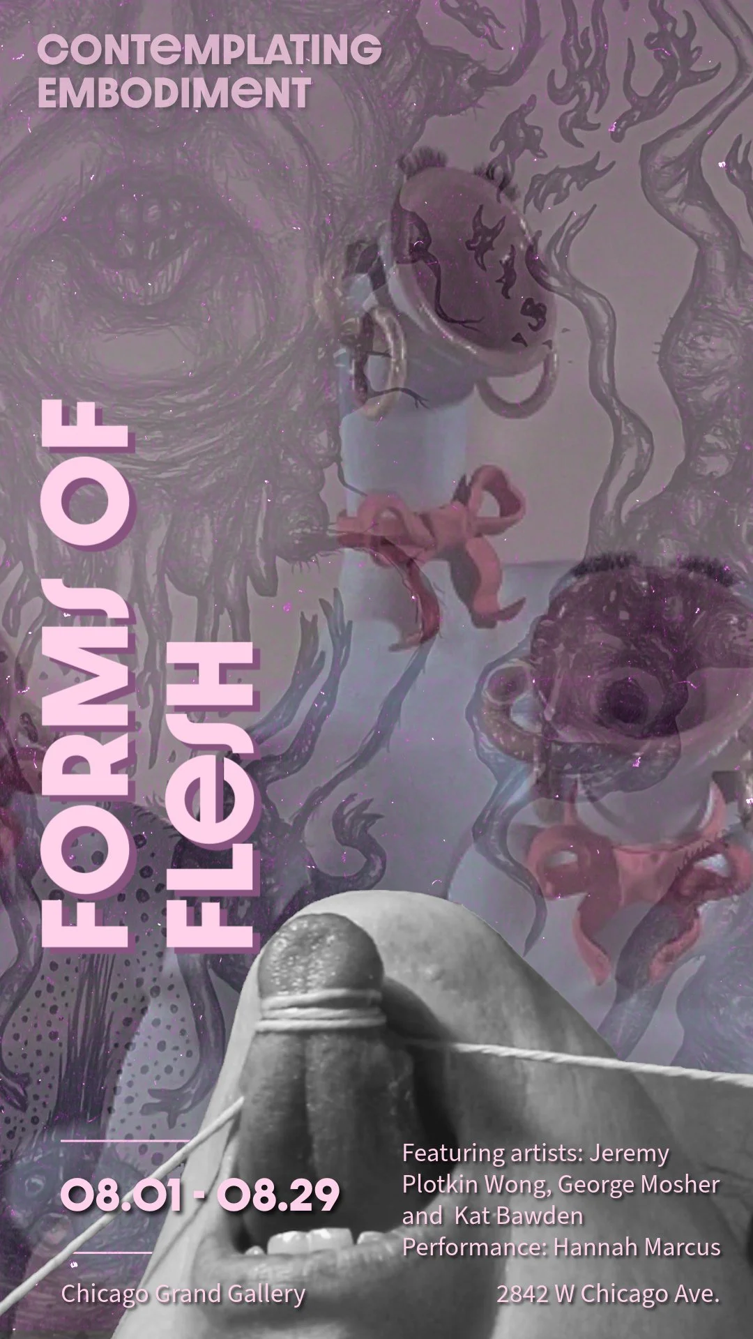 Embodiment is acutely intimate and deeply physical. Attempts to capture it often fall short of fully conveying its complexity. In struggling to isolate the feeling of one’s own skin, or to recall one’s own appearance in a dream, we reveal the primarily sensory nature of inhabiting a body. Forms of Flesh brings together five artists — Jeremy Plotkin Wong, George Mosher (a.k.a. Bingus Blaine), Kat Bawden, and Hannah Murcus in collaboration with Maya Nguyen — who use their artistic instruments to explore the multifaceted phenomenon of the body.