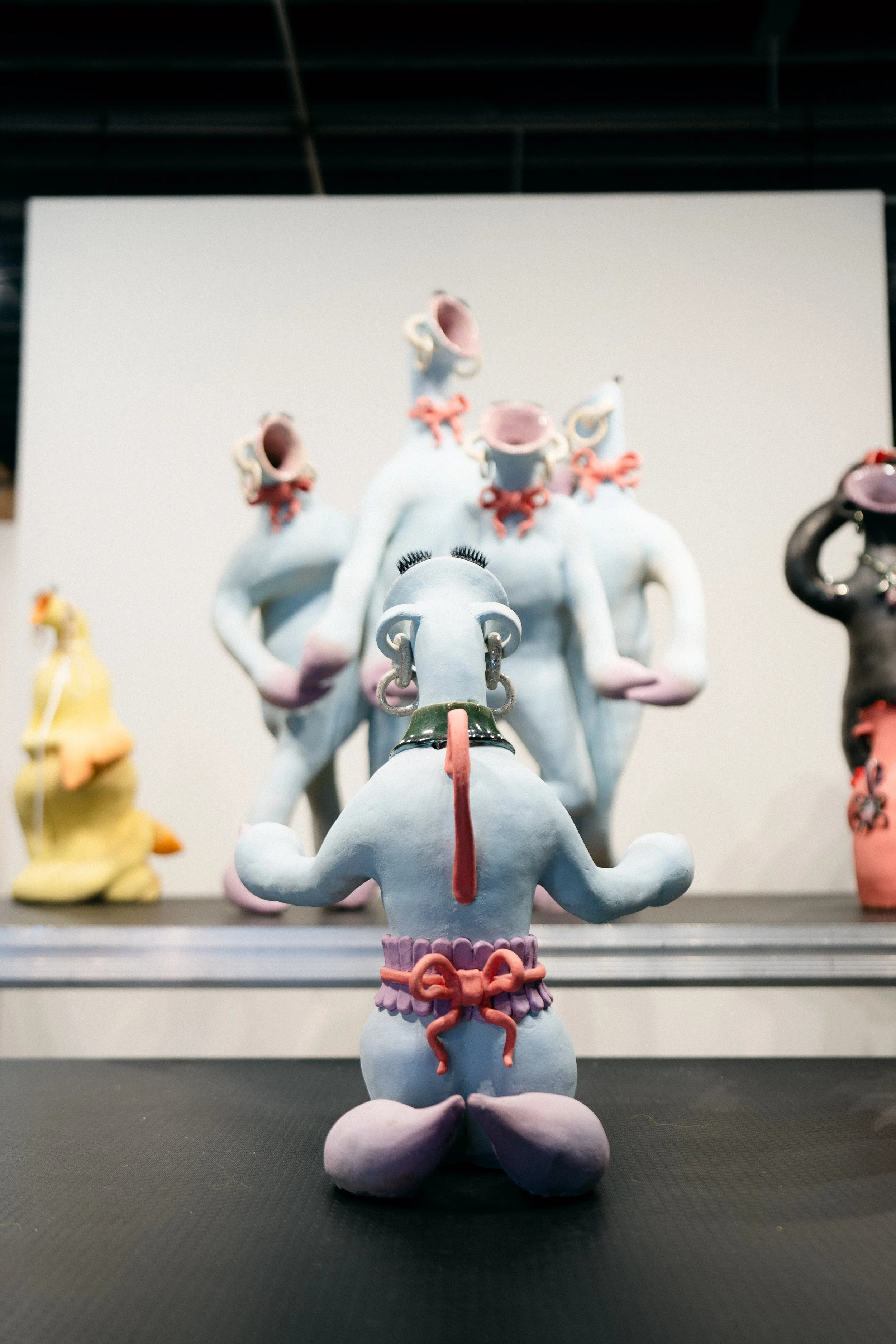 His primary medium is clay, due to its ability to come alive through direct touch; his practice also extends to multimedia sculpture. Influenced by sources as diverse as Chinese decorative arts, funk ceramics, and pop icons like Betty Boop and the Muppets, Plotkin Wong’s work is rooted in humor and whimsy, engaging with the uncanny language of the vessel.