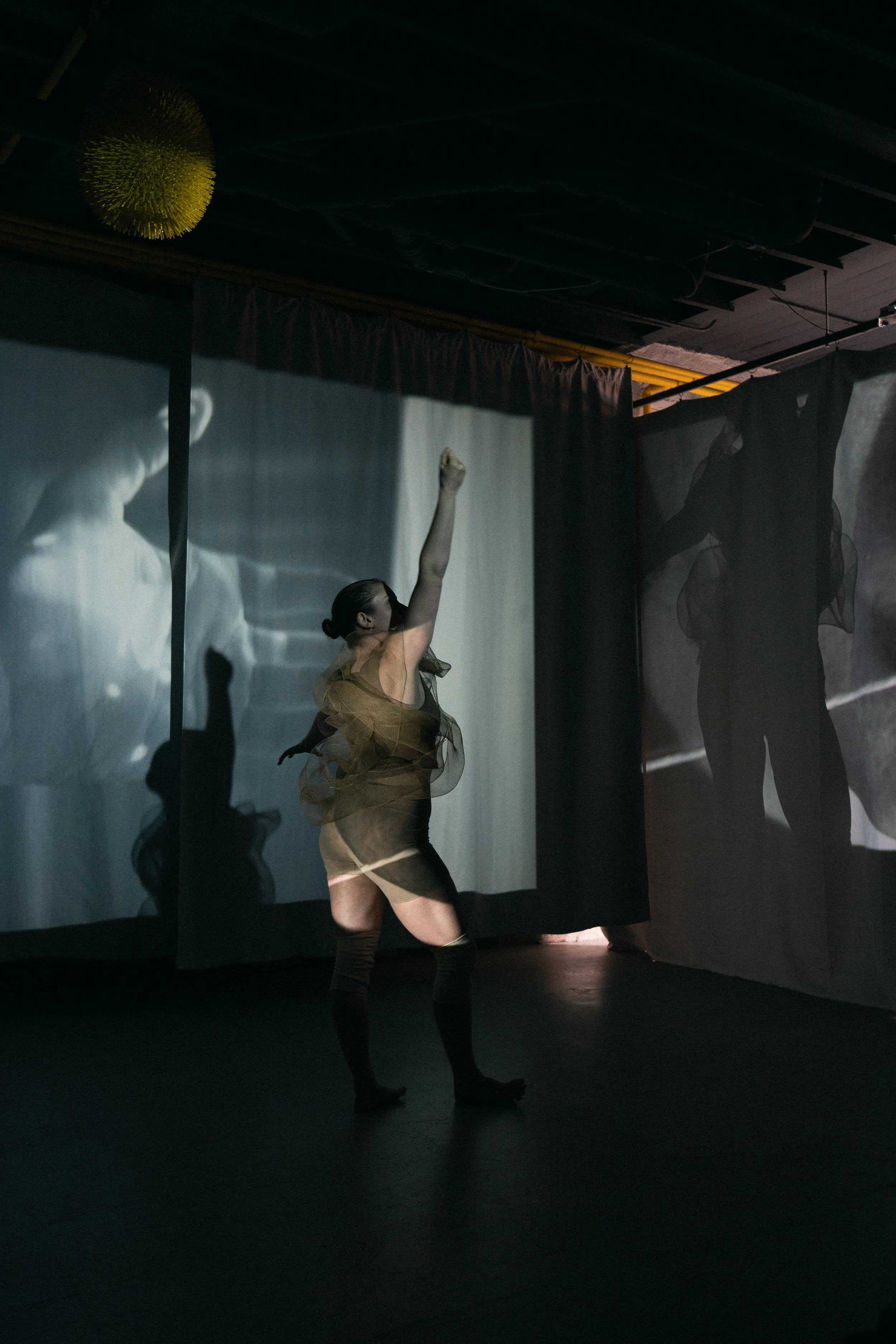 In an effort to incorporate diverse art forms into the discourse of embodiment, the exhibition opening featured a performance by Hannah Marcus and Maya Nguyen. Marcus, a body movement artist, and Nhuyen, an experimental sound artist, collaborated on an improvisational repertoire while incorporating the projected videos by Kat Bawden.